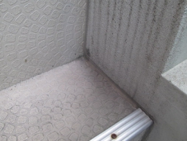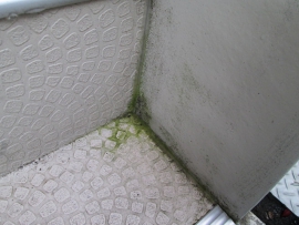 壁面から地面にかけてシミの様にうっすら広い範囲にコケが発生していました。