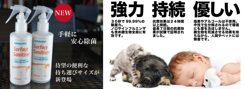 様々な表面(テーブル・床・幼児のまわり・ペットのまわり・浴室・トイレ・台所・靴・車内)の衛生に最適です。